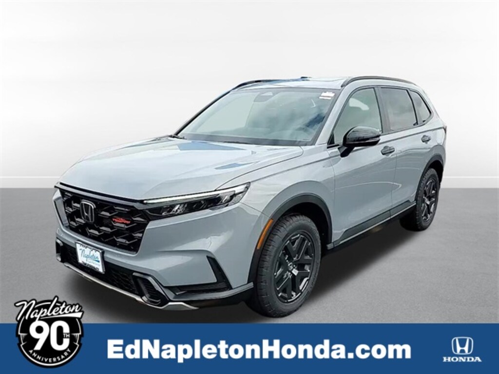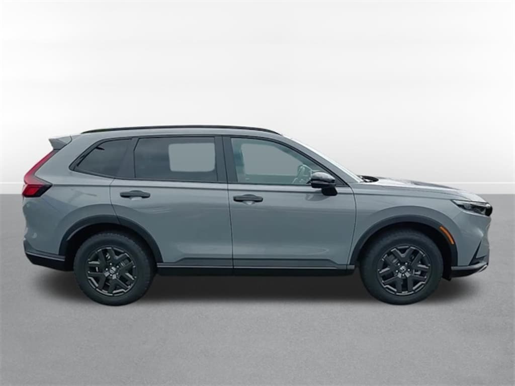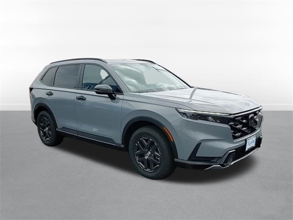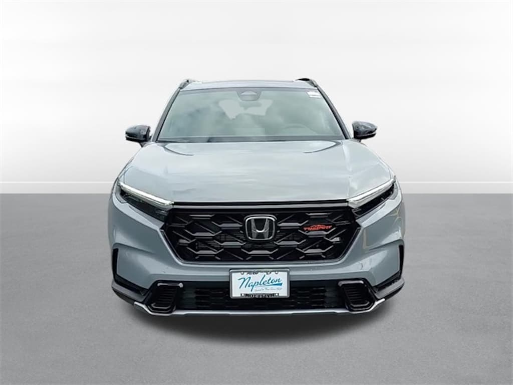 This CR-V Hybrid is well equipped with 4-Wheel Disc Brakes, 8 Speakers, ABS brakes, Adaptive Cruise Control: Adaptive Cruise Control (ACC) with Low-Speed Follow, Air Conditioning, Alloy wheels, Apple CarPlay/Android Auto, Auto High-beam Headlights, Automatic temperature control, Blind Spot Information (BSI) System warning, Brake assist, Bumpers: body-color, Cloth Seat Trim, Compass, Delay-off headlights, Driver door bin, Driver vanity mirror, Dual front impact airbags, Dual front side impact airbags, Electronic Stability Control, Exterior Parking Camera Rear, Four wheel independent suspension, Front anti-roll bar, Front Bucket Seats, Front Center Armrest, Front dual zone A/C, Front reading lights, Fully automatic headlights, Heated door mirrors, Heated Front Bucket Seats, Heated front seats, Heated steering wheel, Illuminated entry, Knee airbag, Leather Shift Knob, Leather steering wheel, Low tire pressure warning, Occupant sensing airbag, Outside temperature display, Overhead airbag, Overhead console, Panic alarm, Passenger door bin, Passenger vanity mirror, Power door mirrors, Power driver seat, Power moonroof, Power steering, Power windows, Radio data system, Radio: 320-Watt AM/FM Audio System, Rear anti-roll bar, Rear reading lights, Rear seat center armrest, Rear side impact airbag, Rear window defroster, Rear window wiper, Remote keyless entry, Security system, Speed control, Speed-sensing steering, Speed-Sensitive Wipers, Split folding rear seat, Spoiler, Steering wheel mounted audio controls, Telescoping steering wheel, Tilt steering wheel, Traction control, Trip computer, Turn signal indicator mirrors, Variably intermittent wipers, and Wheels: 18" Shark Gray.