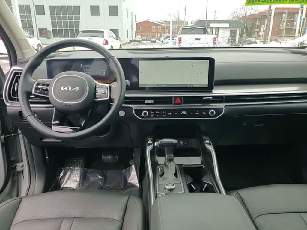 This Sorento is well equipped with Panoramic Sunroof Package (LED Interior Lighting and Panoramic Power Sunroof w/Power Sunshade), 3rd row seats: split-bench, 4-Wheel Disc Brakes, 6 Speakers, ABS brakes, Air Conditioning, Alloy wheels, AM/FM radio: SiriusXM, Apple CarPlay & Android Auto, Auto High-beam Headlights, Auto-Dimming Mirror w/HomeLink, Automatic temperature control, Brake assist, Bumpers: body-color, Carpeted Floor Mats, Delay-off headlights, Driver door bin, Driver vanity mirror, Dual front impact airbags, Dual front side impact airbags, Electronic Stability Control, Emergency communication system: 911 Connect, Exterior Parking Camera Rear, Four wheel independent suspension, Front anti-roll bar, Front Bucket Seats, Front Center Armrest, Front dual zone A/C, Front reading lights, Fully automatic headlights, Heated door mirrors, Heated Front Bucket Seats, Heated front seats, Illuminated entry, Illuminated Hatch Sill Plate, Knee airbag, Leather Shift Knob, Leather steering wheel, Low tire pressure warning, Mudguards, Navigation System, Occupant sensing airbag, Outside temperature display, Overhead airbag, Overhead console, Panic alarm, Passenger door bin, Passenger vanity mirror, Power door mirrors, Power driver seat, Power steering, Power windows, Radio data system, Radio: AM/FM Standard Sound System, Rear anti-roll bar, Rear reading lights, Rear seat center armrest, Rear side impact airbag, Rear window defroster, Rear window wiper, Remote keyless entry, Security system, Speed control, Speed-sensing steering, Split folding rear seat, Spoiler, Steering wheel mounted audio controls, SynTex Artificial Leather Seat Trim, Tachometer, Telescoping steering wheel, Tilt steering wheel, Traction control, Trip computer, Turn signal indicator mirrors, Variably intermittent wipers, Wheel Locks, and Wheels: 18" Gloss Black Alloy.