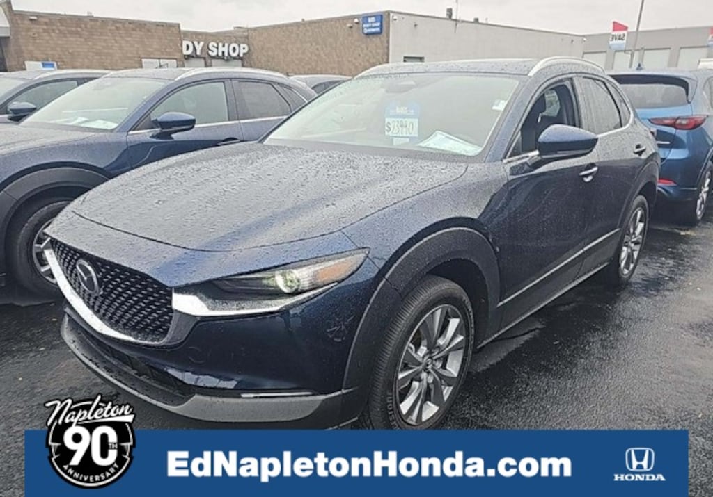 This Mazda CX-30 is well equipped with 4-Wheel Disc Brakes, 4.095 Axle Ratio, 6 Speakers, ABS brakes, Air Conditioning, Alloy wheels, AM/FM radio, AppLink/Apple CarPlay and Android Auto, Auto High-beam Headlights, Automatic temperature control, Brake assist, Bumpers: body-color, Cargo Tray, Compass, Delay-off headlights, Driver door bin, Driver vanity mirror, Dual front impact airbags, Dual front side impact airbags, Electronic Stability Control, Emergency communication system: Mazda Connected Services (3-year complimentary trial included), Exterior Parking Camera Rear, Front anti-roll bar, Front Bucket Seats, Front Center Armrest, Front dual zone A/C, Front reading lights, Front wheel independent suspension, Fully automatic headlights, Heated door mirrors, Heated Front Bucket Seats, Heated front seats, Illuminated entry, Knee airbag, Leather Shift Knob, Leather steering wheel, Leatherette Seat Trim, Low tire pressure warning, MAZDA CONNECT Infotainment System, Memory seat, Occupant sensing airbag, Outside temperature display, Overhead airbag, Overhead console, Panic alarm, Passenger door bin, Passenger vanity mirror, Power door mirrors, Power driver seat, Power moonroof, Power steering, Power windows, Radio data system, Radio: AM/FM Audio System, Rain sensing wipers, Rear seat center armrest, Rear side impact airbag, Rear window defroster, Rear window wiper, Remote keyless entry, Speed control, Speed-sensing steering, Split folding rear seat, Spoiler, Stainless Steel Rear Bumper Guard, Steering wheel mounted audio controls, Tachometer, Telescoping steering wheel, Tilt steering wheel, Traction control, Trip computer, Turn signal indicator mirrors, Variably intermittent wipers, Wheel Locks, and Wheels: 18" x 7J Aluminum Alloy.