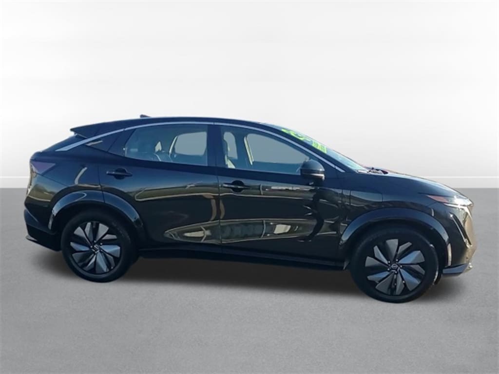 This Ariya is well equipped with 11.090 Final Drive Ratio, 19" Alloy Wheels, 4-Wheel Disc Brakes, 6 Speakers, ABS brakes, Air Conditioning, Alloy wheels, AM/FM radio: SiriusXM, Auto High-beam Headlights, Automatic temperature control, Brake assist, Bumpers: body-color, Carpeted Floor Mats & First Aid Kit, Delay-off headlights, Driver door bin, Driver vanity mirror, Dual front impact airbags, Dual front side impact airbags, Electronic Stability Control, Emergency communication system: NissanConnect EV & Services, Four wheel independent suspension, Front anti-roll bar, Front Bucket Seats, Front Center Armrest, Front dual zone A/C, Front fog lights, Front reading lights, Garage door transmitter: HomeLink, Heads-Up Display, Heated door mirrors, Heated Front Bucket Seats, Heated front seats, Heated rear seats, Heated steering wheel, Illuminated entry, Knee airbag, Leather steering wheel, Leatherette Seating Surfaces, Low tire pressure warning, Memory seat, Navigation system: Nissan Door to Door Connected Navigation, Occupant sensing airbag, Outside temperature display, Overhead airbag, Panic alarm, Passenger door bin, Passenger vanity mirror, Power door mirrors, Power driver seat, Power Liftgate, Power moonroof, Power passenger seat, Power steering, Power windows, Radio: AM/FM Audio System, Rain sensing wipers, Rear anti-roll bar, Rear reading lights, Rear seat center armrest, Rear side impact airbag, Rear window defroster, Rear window wiper, Remote keyless entry, Security system, Speed control, Speed-sensing steering, Speed-Sensitive Wipers, Split folding rear seat, Spoiler, Steering wheel mounted audio controls, Telescoping steering wheel, Tilt steering wheel, Traction control, Trip computer, and Variably intermittent wipers.